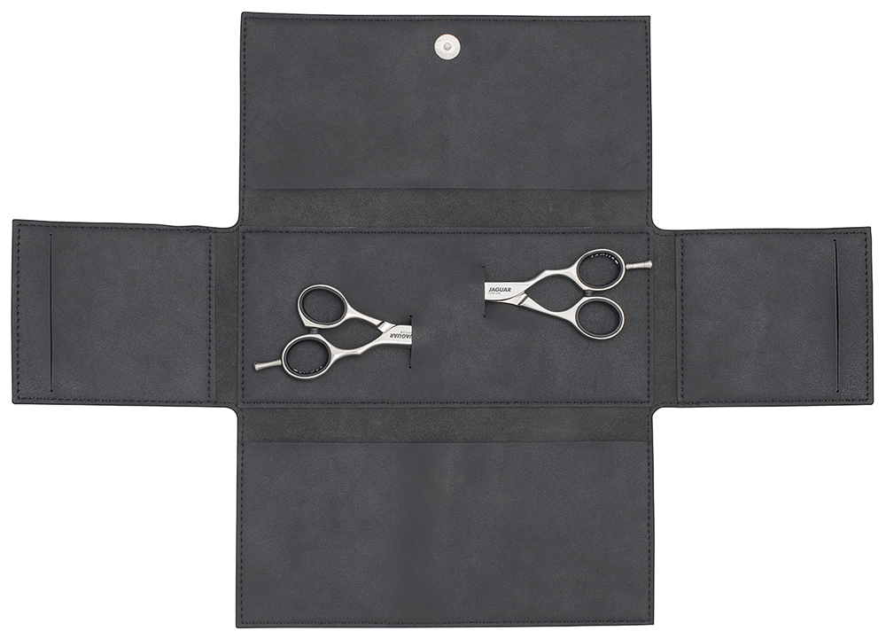 Футляр для ножниц из элегантной «подержанной» кожи с частичным тиснением под животных для двух пар ножниц для волос. Четыре практичных отделения для оптимальной организации.